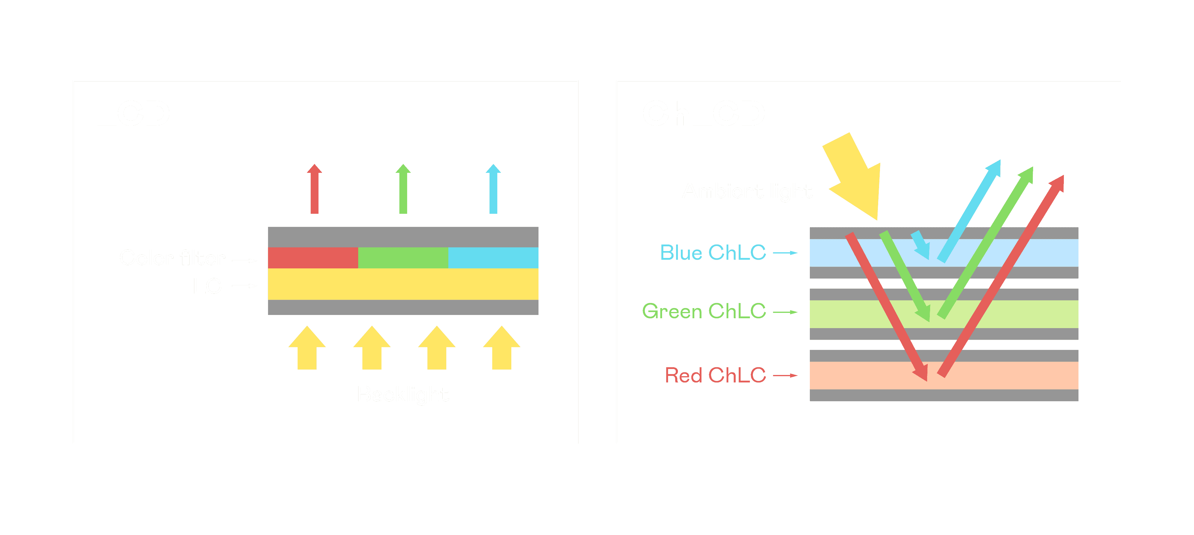 ChLCD 胆固醇液晶就如同纸张一样,,,,透过反射环境光来显示影像,,,因此长时间观看不易造成人眼视觉疲劳,,,可达到护眼效果。。。当处于户外阳光下使用,,LCD 影像容易失真而不易观看,,,但胆固醇液晶仍可维持较佳的影像品质。。。。