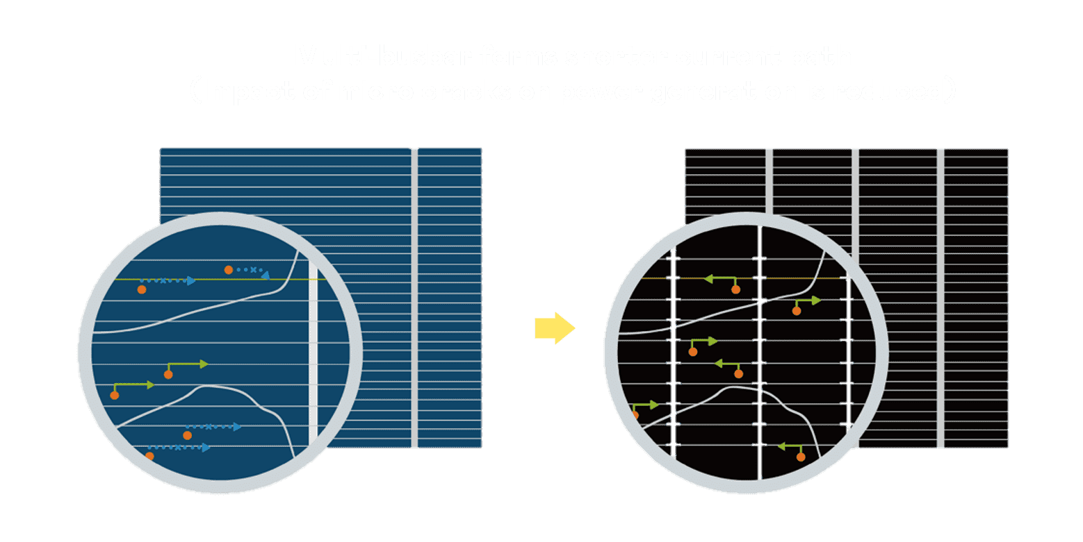 - 多条电极栅结构,,可有效降低外力对于电池的影响,,,限制电池隐裂 (Micro-cracks) 范围,,,,防止电流传输路径 (Current distribution) 之损坏进一步扩大。。