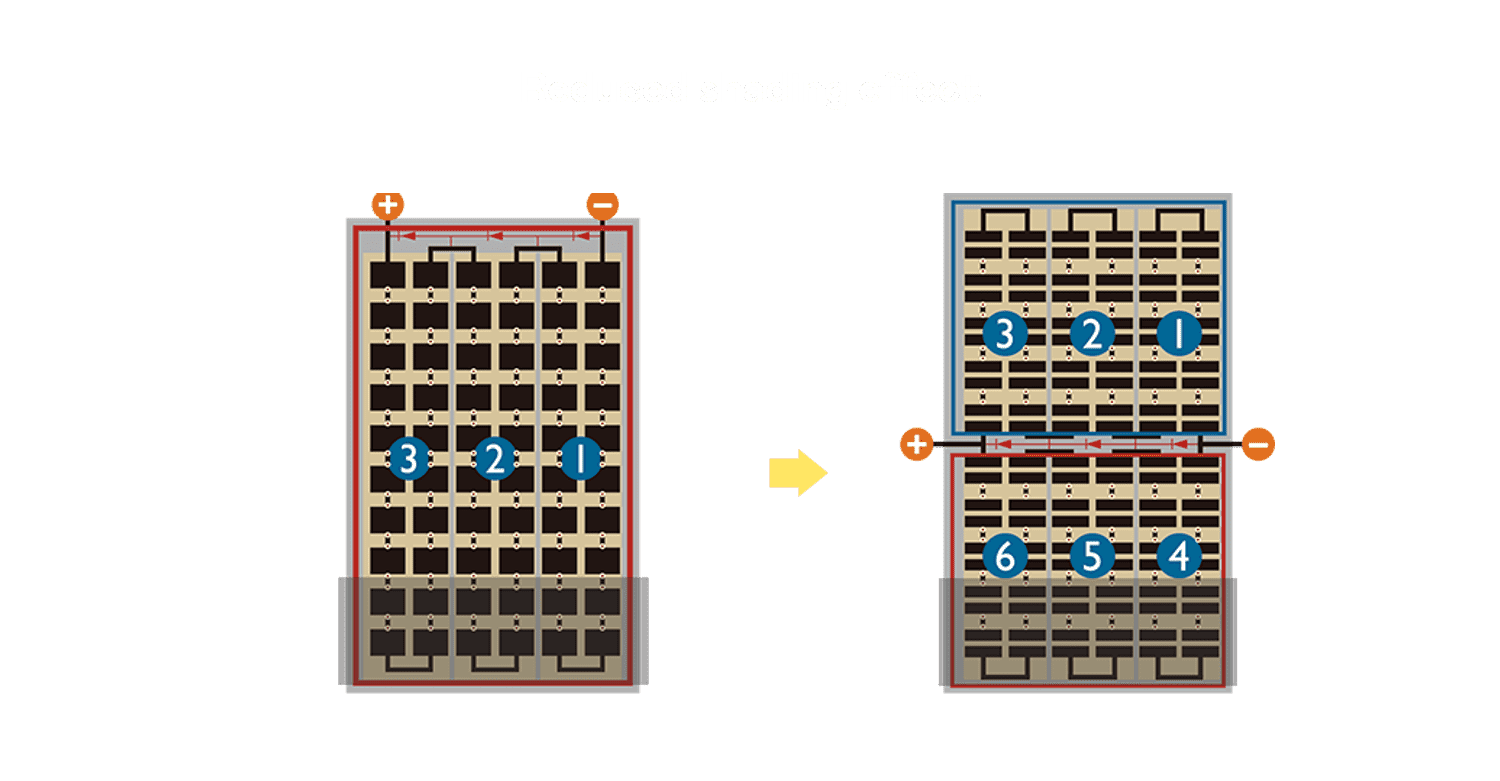 优化的太阳能电池结构设计,,,不仅提高电流收集效率,,,降低电池隐裂,,使太阳能模组长期维持稳定的输出效能,,,,提高营运效益。。