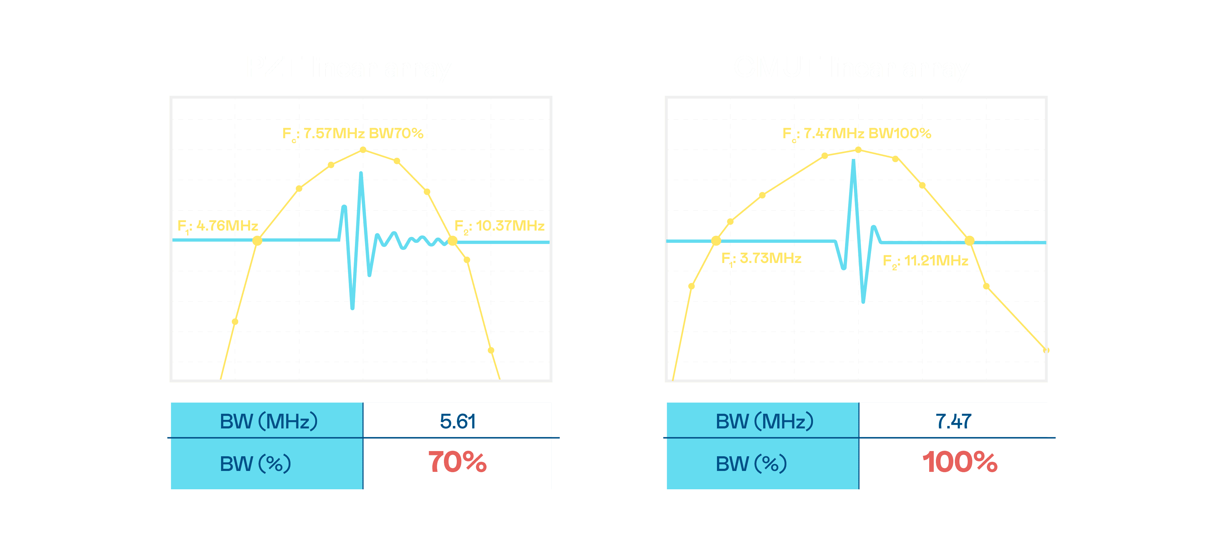 超音波影像的解析度高低,,,,首先取决于探头能发出的讯号频宽。。。。壹号平台 CMUT 可提供高清晰的超音波讯号,,,,提供高频宽、、、高灵敏度、、、影像纹理细节更高的超音波影像,,,协助医护人员缩短影像判读时间及利用精准的医疗影像进行诊断。。。。