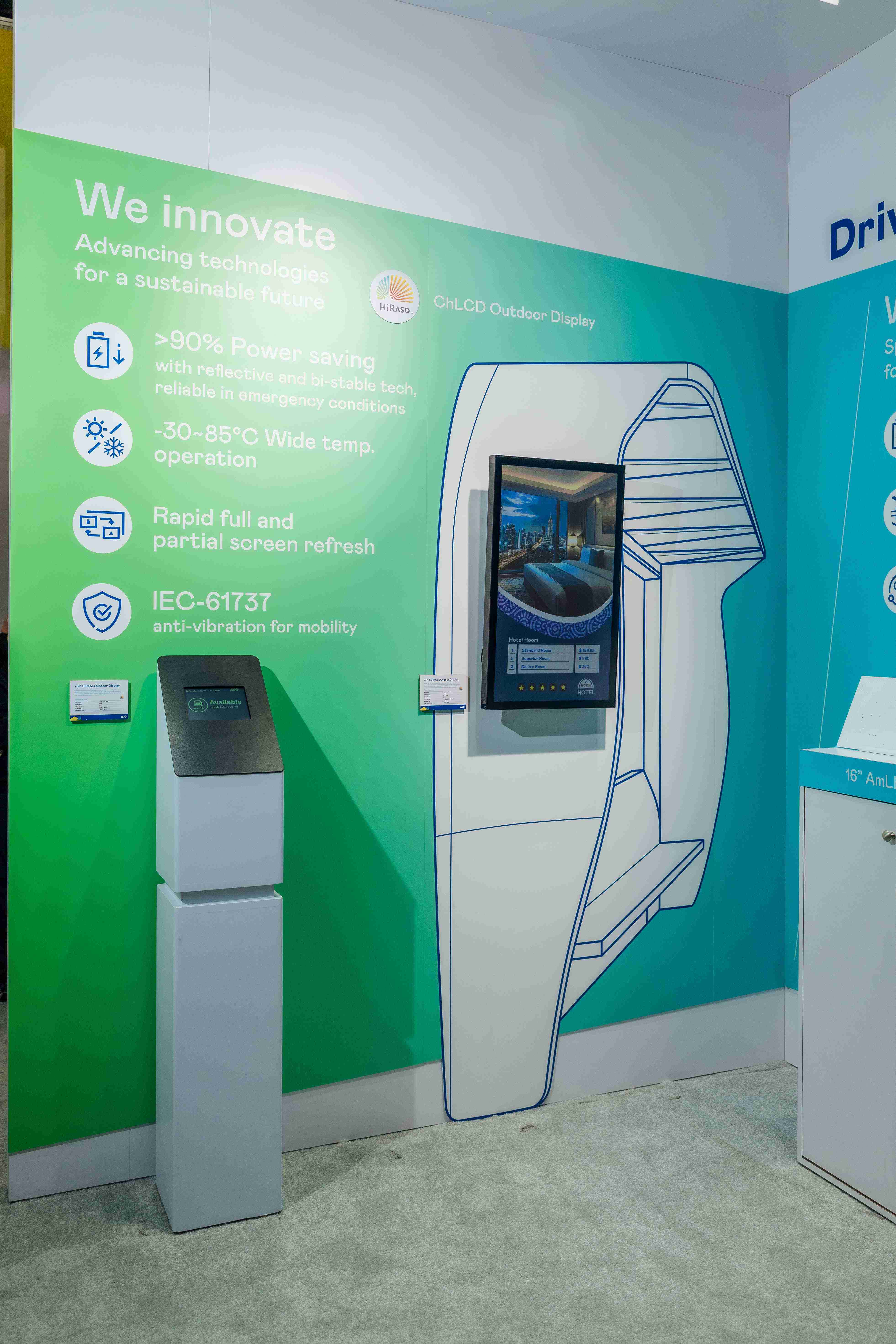 HiRaso胆固醇液晶显示器运用反射环境光线的方式,,,,呈现影像显示时零耗能的环保省电诉求,,光线愈强愈能呈现绝佳的色彩饱和度及显示效果,,,,同时在摄氏-30度至85度间宽温的使用优势,,,为户外电子看板的新首选。。。。